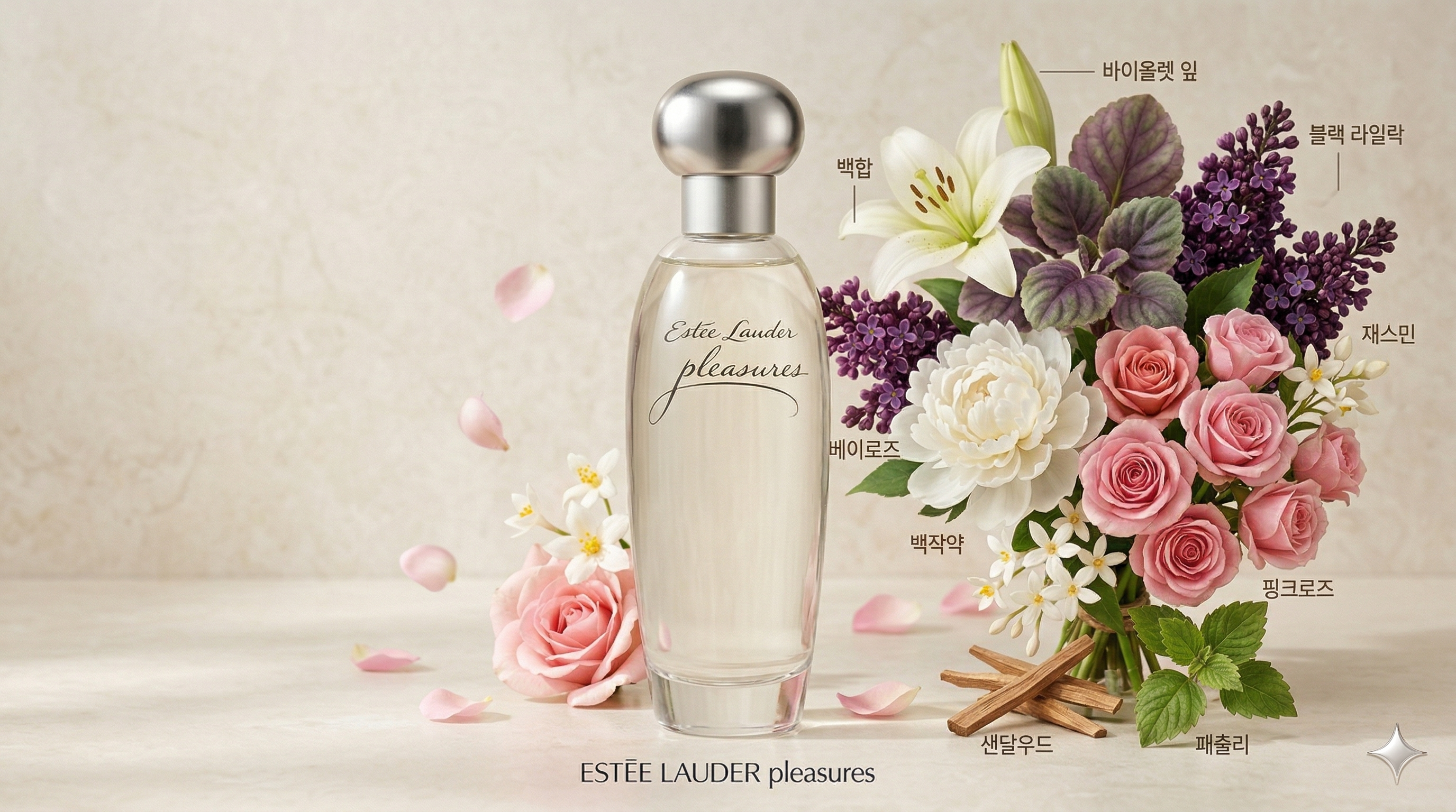 에스티로더 플레져는 '쉬어 플로럴(Sheer Floral)' 계열의 정석입니다. 인위적인 향료 느낌이 아니라 자연 그대로의 꽃향기를 옮겨놓은 듯한 것이 특징입니다.